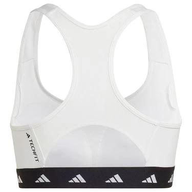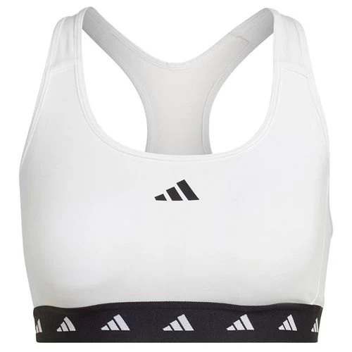 Get ready for any workout while feeling good in classic, versatile pieces from adidas. The Power React Medium Support Tech bra has a racerback, keyhole cutout, triangle front mesh, and removable pads. Made with Primegreen recycled materials containing high performance AEROREADY technology.