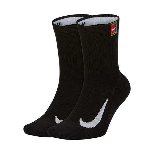 Hit the court in the Nike Court Multiplier Cushion Crew Socks (Black). These socks feature Dri-Fit technology to help with sweat winking protection. The bottom cushioning in high-wear areas allow for long-lasting comfort. An elastic arch band helps circulate blood flow and give you additional support. 2 pairs